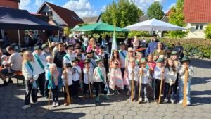 Mit dem Laubholen begann am Samstag das Fest, 19 Kinder schmückten das Dorf. Am Nachmittag wurde das neue Regentenpaar ermittelt. Angeführt vom Hauptmann Moritz Kumutat stand der Sonntag dann im Zeichen der großen Parade auf der Hauptstraße. Auch der 25-jährige Jubelkönig Lukas Siepmann (Bild unten) nahmen den Vorbeimarsch der jungen Schützen ab. Der 50-jährige Jubelkönig Martin Ernst war Samstags anwesend.